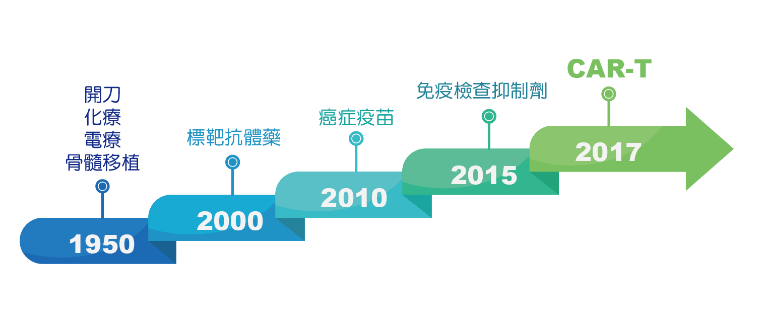 2014年賓州大學發表30個復發難治的急性淋巴性白血病病人,其中15個病人在輸注CAR-T細胞之前曾經接受過血液幹細胞移植,在注射自體CAR-T細胞後,27個病人(90%)達到完全緩解,半年後仍有73%無復發。這個結果顯示CAR-T細胞治療突破了以往化療和血液幹細胞移植治療的困境。